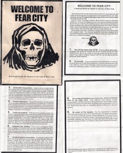 Salah satu dokumen yang paling mencolok menggambarkan NY era itu adalah pamflet yang banyak dicetak dan disebarkan ke luar NY bahkan ke luar Amerika, dengan titel yang sangat mencekam; “Welcome to Fear City: A Survival Guide to Visitor to the City of New York”, berisi tips-tips penting untuk bagaimana tetap aman ketika berkunjung ke kota itu.